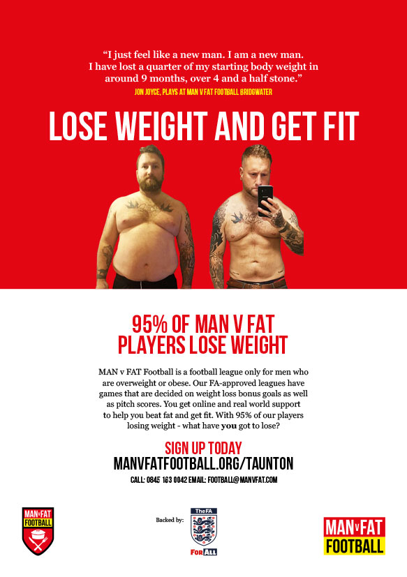 MAN v FAT Football has been helping local men live lighter, fitter and healthier lives in Taunton since August 2017. I am proud to have played a part in the incredible physical, mental and health improvements seen in our players.